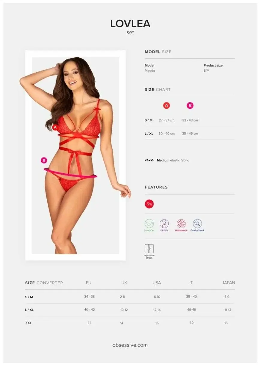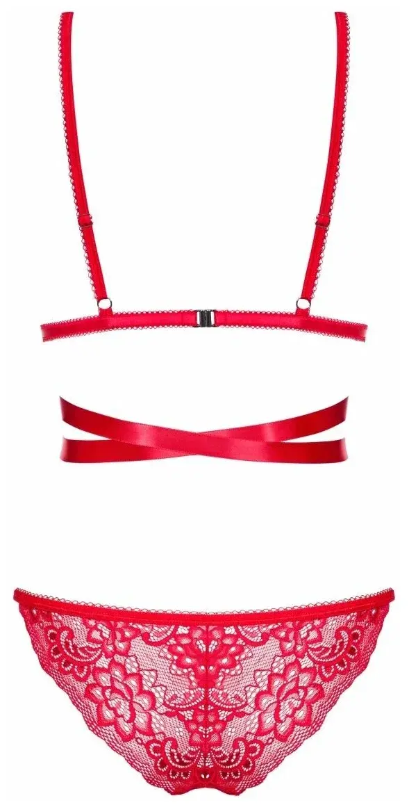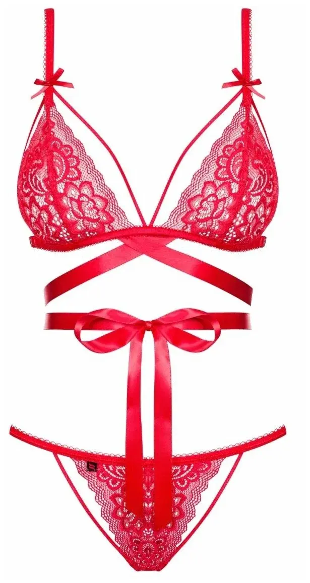 Сексуальный комплект белья. Бра с мягкими кружевными чашечками и тонкими ремешками декорирован бантиками. Бретели регулируются по длине, сзади застежка на крючок. Красивая атласная лента обвивается вокруг тела и завязывается бантом спереди. Трусики "танга" в тон дополняют бра.